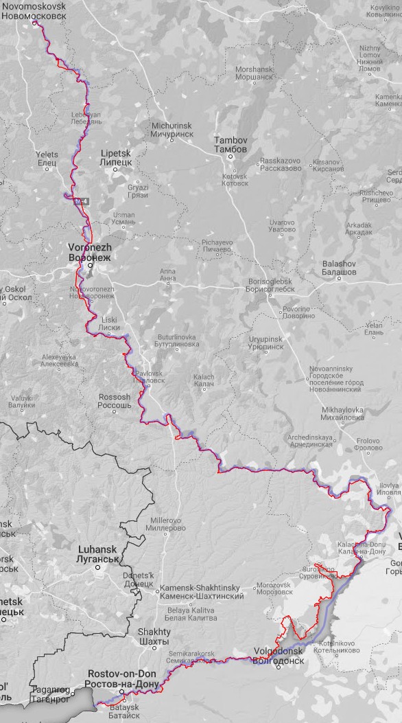уже и не вспомнить что навеяло в 13 году, но вот родилась такая задумка. тогда попутчиков не нашлось, а в одиночку я еще не ездил. шли года... и вот пришла пандемия с закрытыми границами - тот самый момент для этого маршрута. поездки в одного с того времени уже не проблема, да и внедорожной езды с каждым годом прибавляется, лишь бы поскорее съехать с трассы, асфальта. так, если еду в сторону кавказа, то не пилю монотонно по М4, а неспешно мелкими дорожками между ней и трассой на волгоград. дня за 3-4 до кавказа доезжаешь, что конечно большинству не позволительно по времени. но как раз в эти поездки, когда едешь, хоть и по асфальту, но по пустой дороге, и местами видишь донские пригорки, пейзажи - необходимость проехать вдоль дона вспоминалась. конец зимы - осень, начал планировать. первоначальный трек прокладывал по асфальту и накатанным грунтовкам, но продолжил его уже всевозможными тропами, лишь бы ближе в берегу, а потом и первоначальный участок дополнил проездами близ берега. osm + спутники Google Yandex Maxar Bing + треки osm и strava, вышло так (кликабельно): дон ~1850км, трек ~2100км